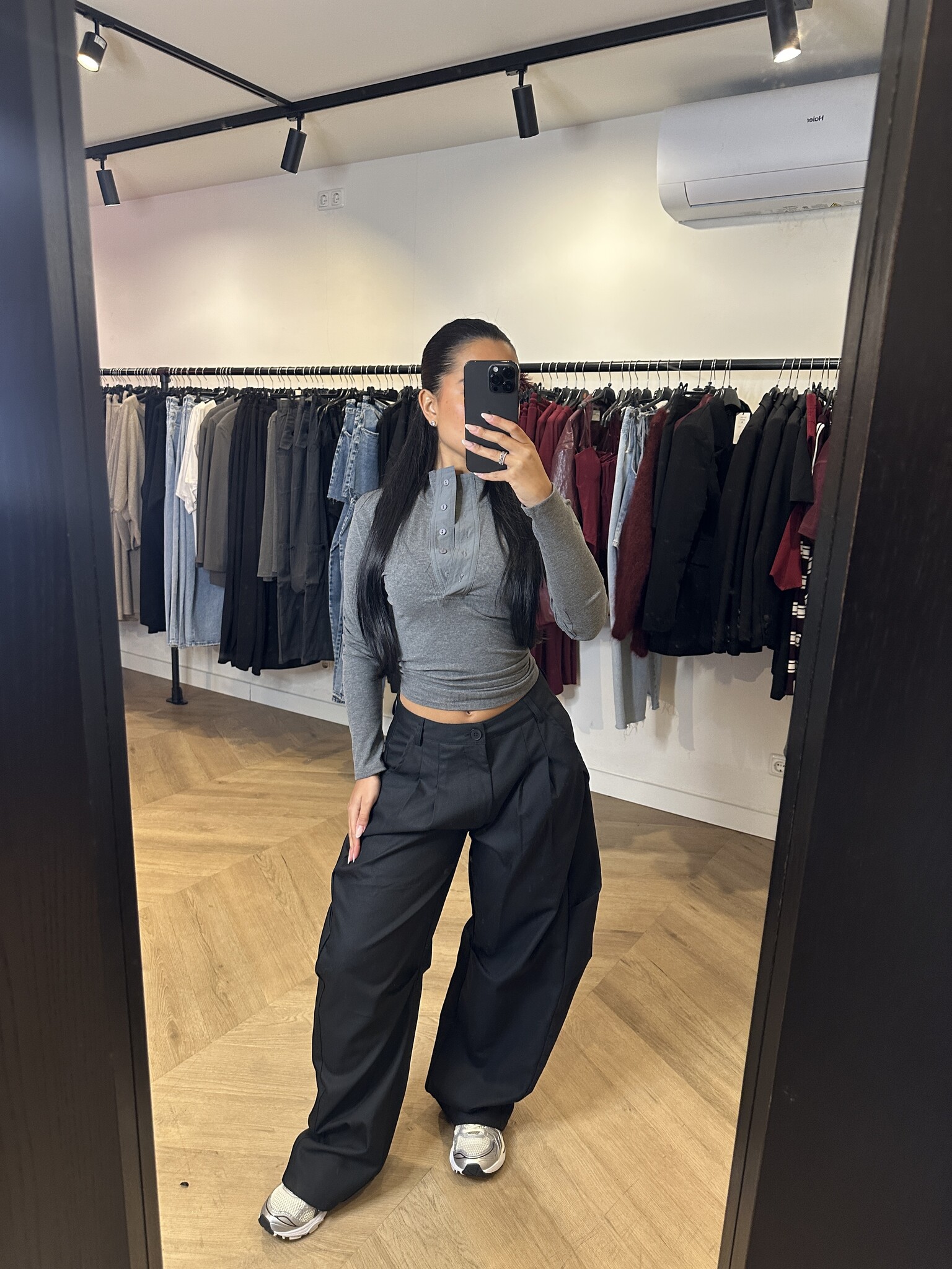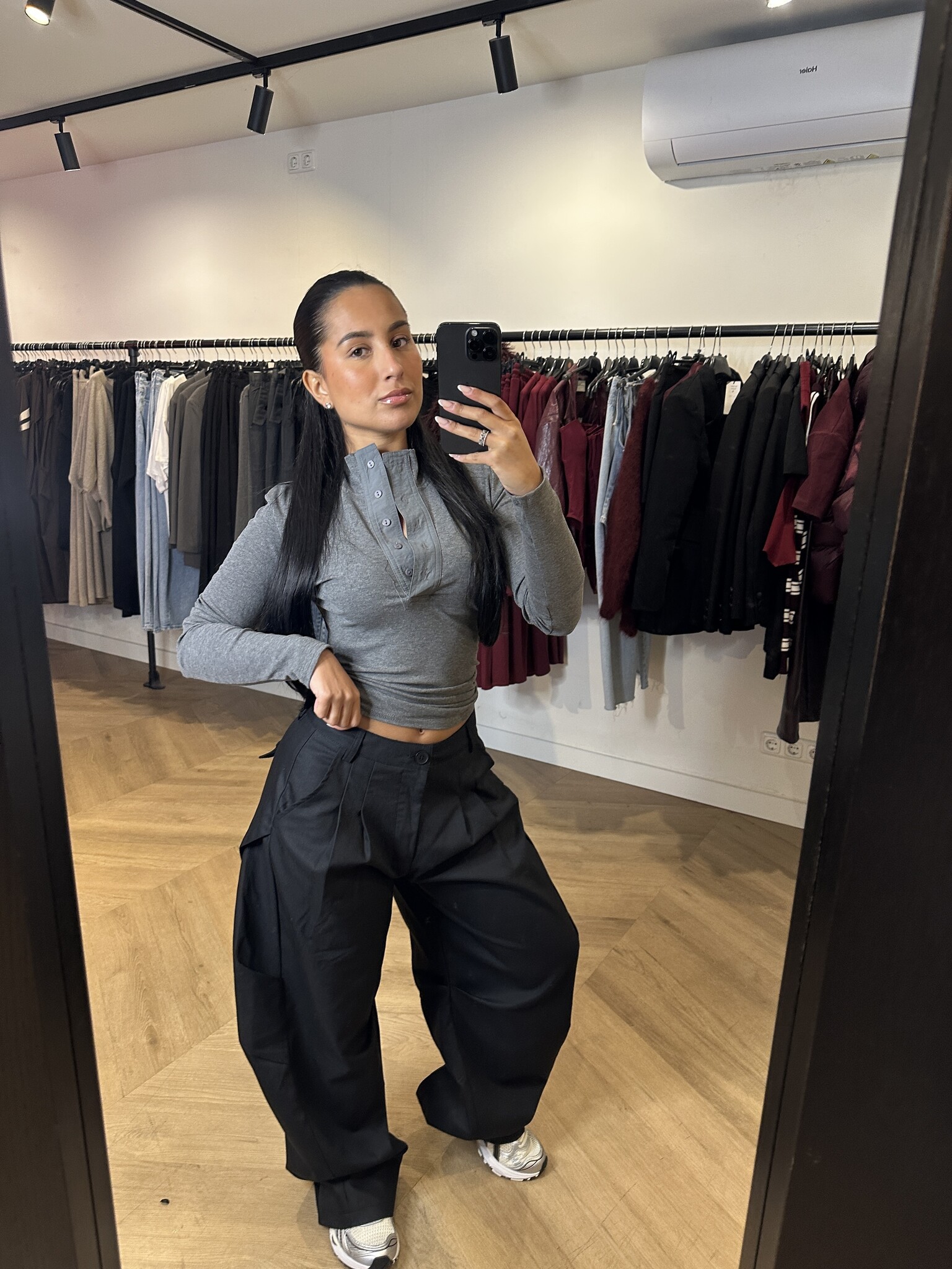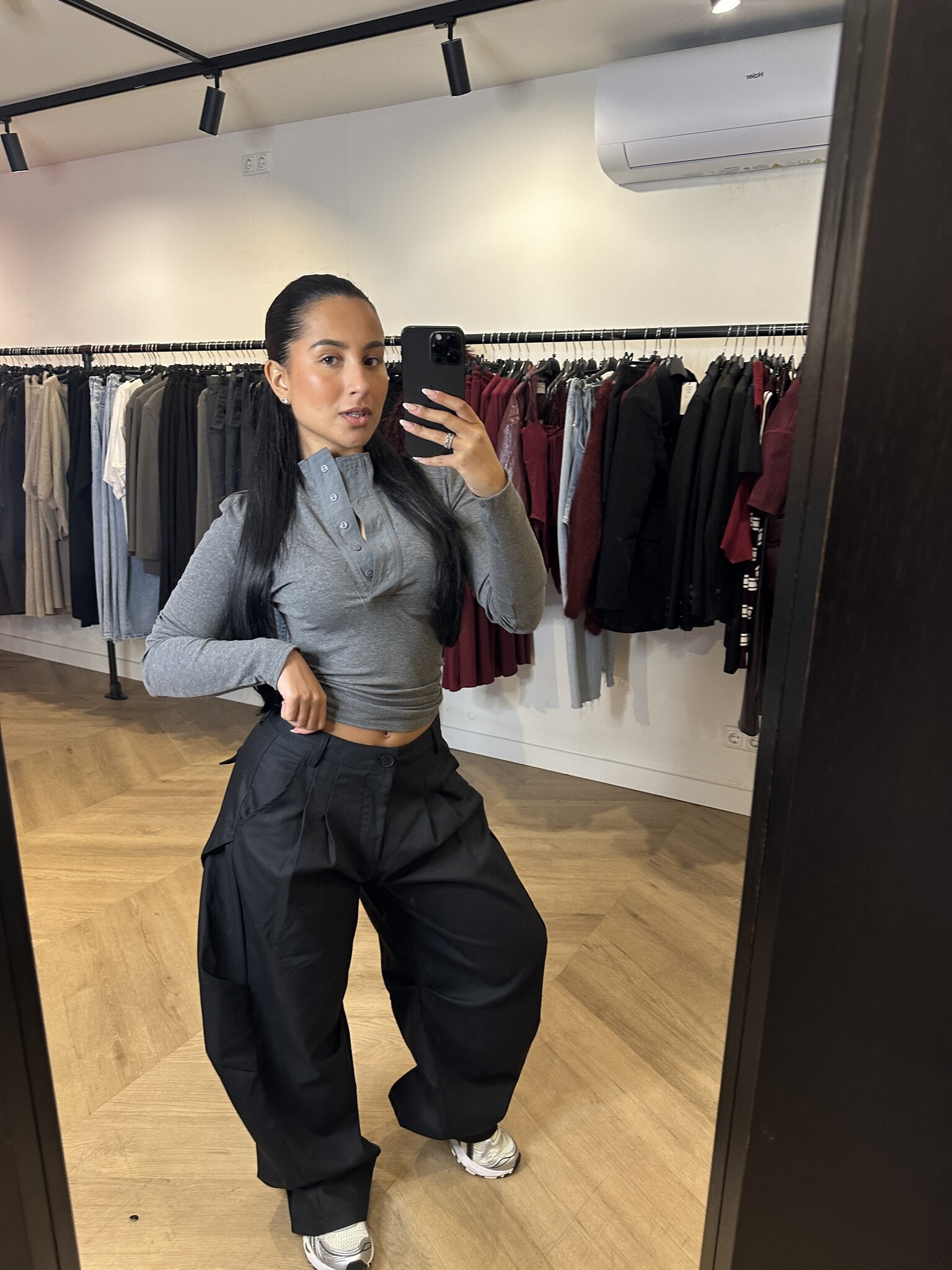 Pasvorm: Het Polo T-shirt is verkrijgbaar in zwart en grijs en heeft een aansluitende pasvorm. Het kraagje kan zowel hoog als laag gedragen worden dankzij de knoopjes. Het T-shirt is one size en past van XS tot L, en is leuk te combineren met de Cargo Balloon Pants voor een stoere, casual look.