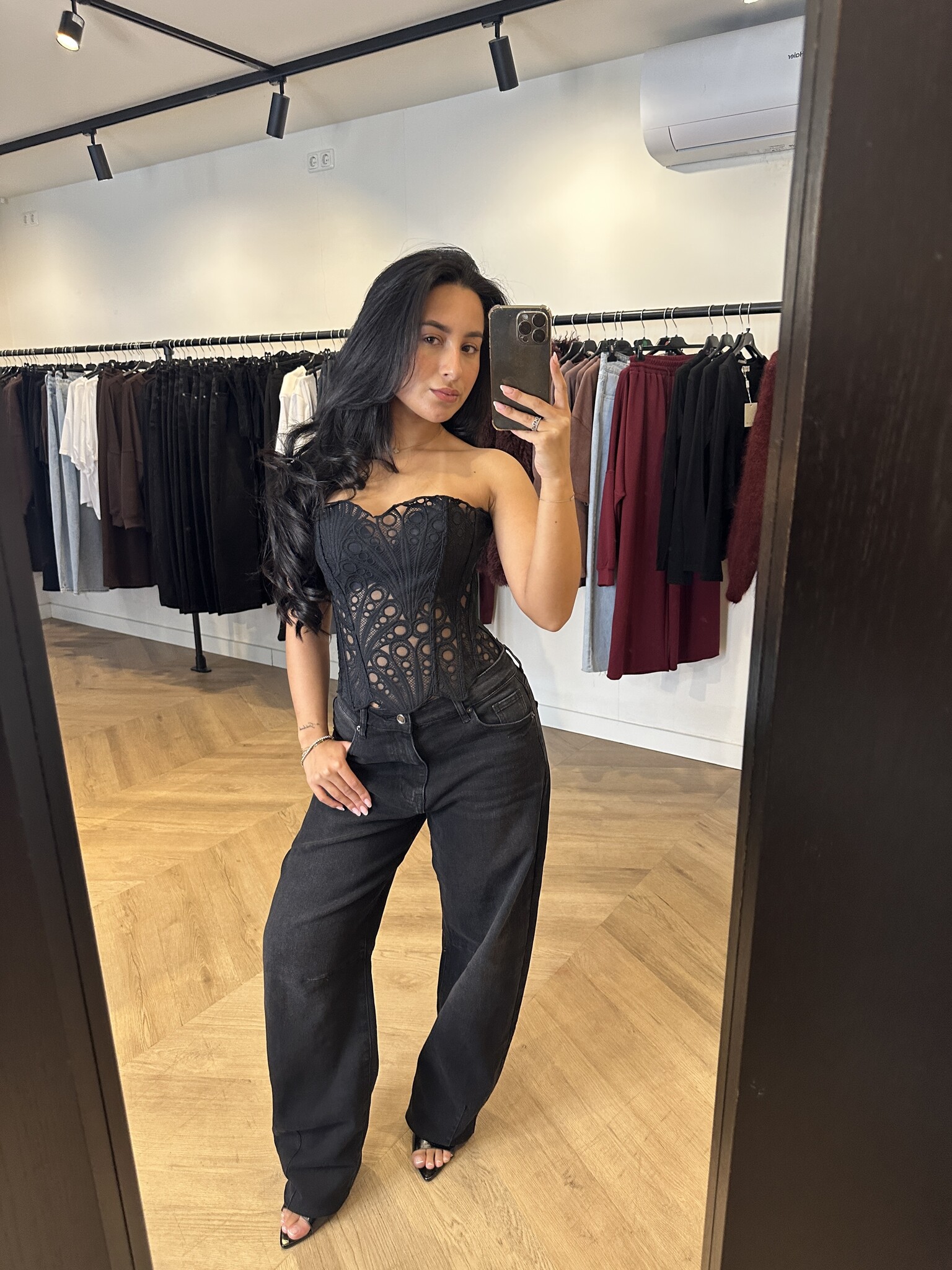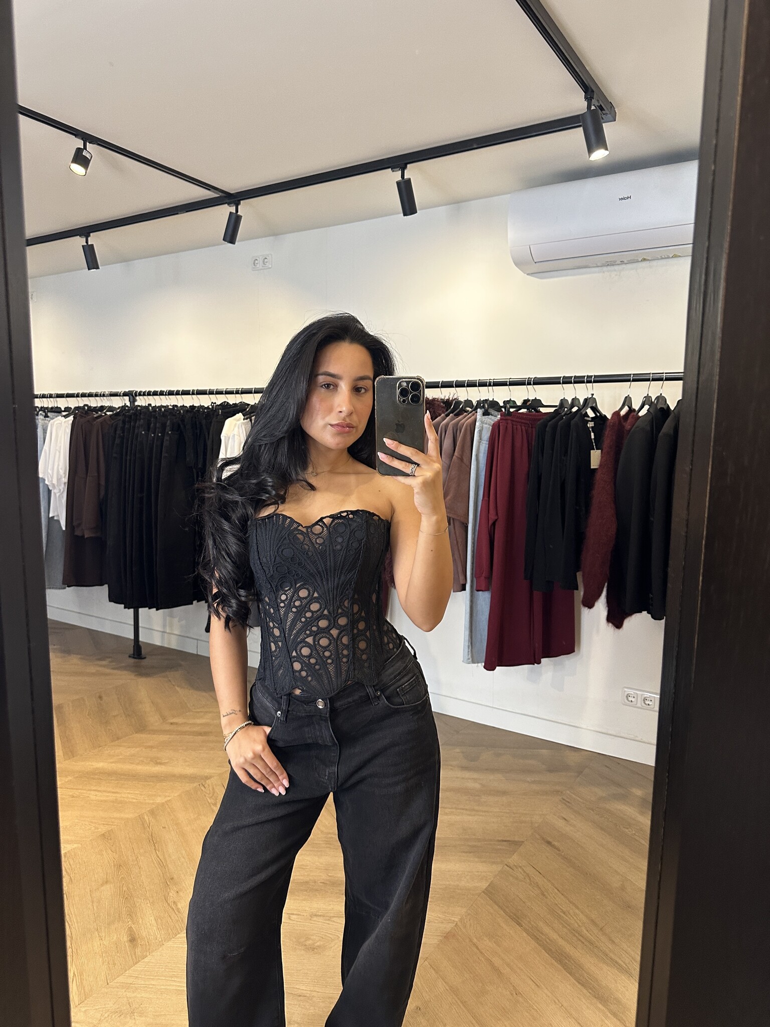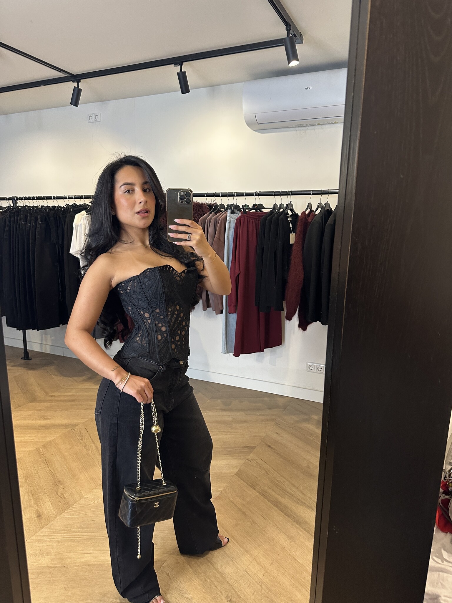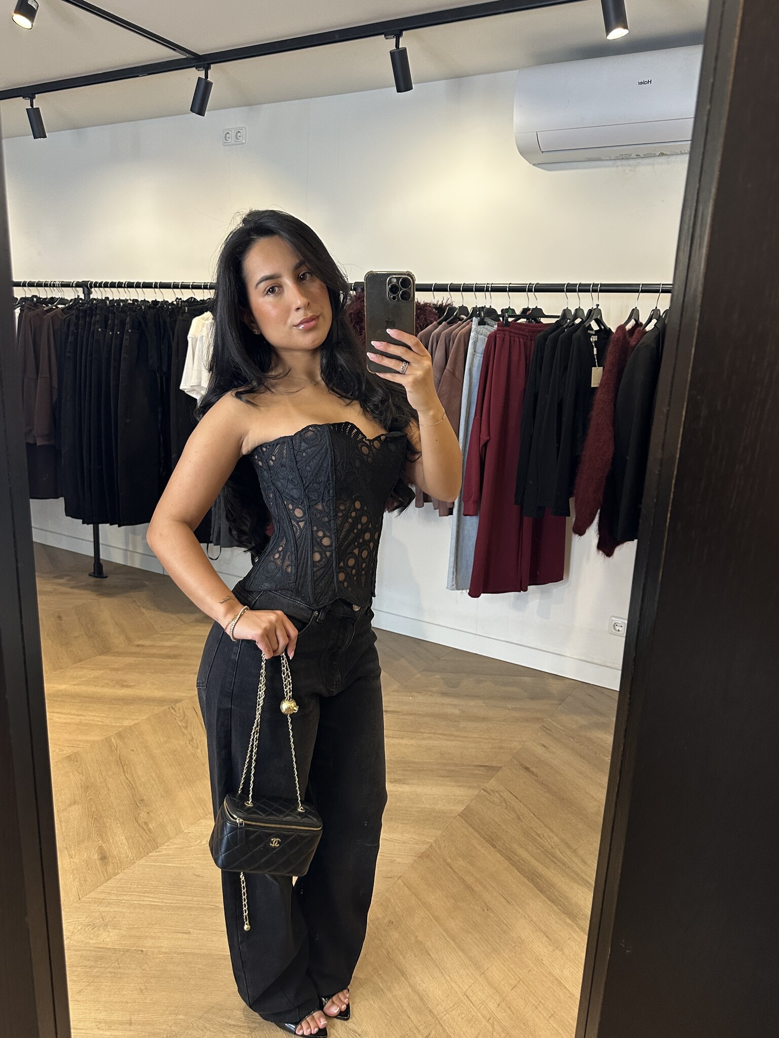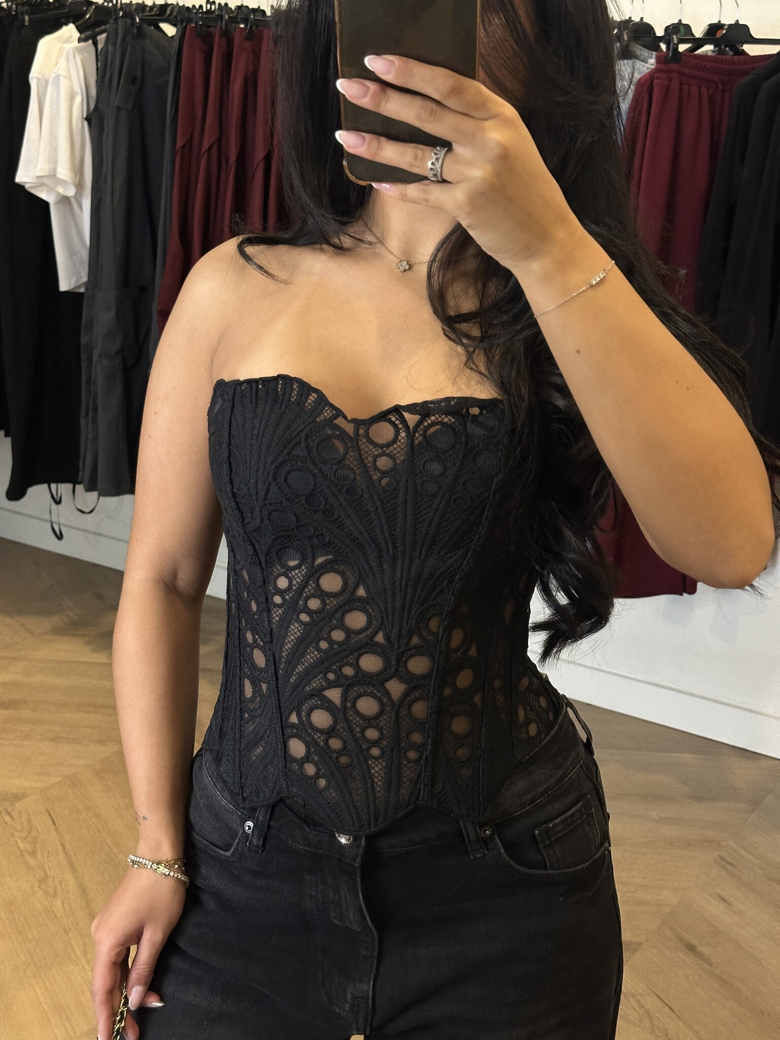 Omschrijving: Dit lace corset heeft een elegante uitstraling en een mooie, aansluitende fit. Het kant geeft een vrouwelijke touch en maakt het item perfect om te dragen als statement piece of subtiel te combineren onder een blazer. Het corset is achter te verstellen doormiddel van een vetersluiting waardoor je hem strakker en losser kunt dragen.