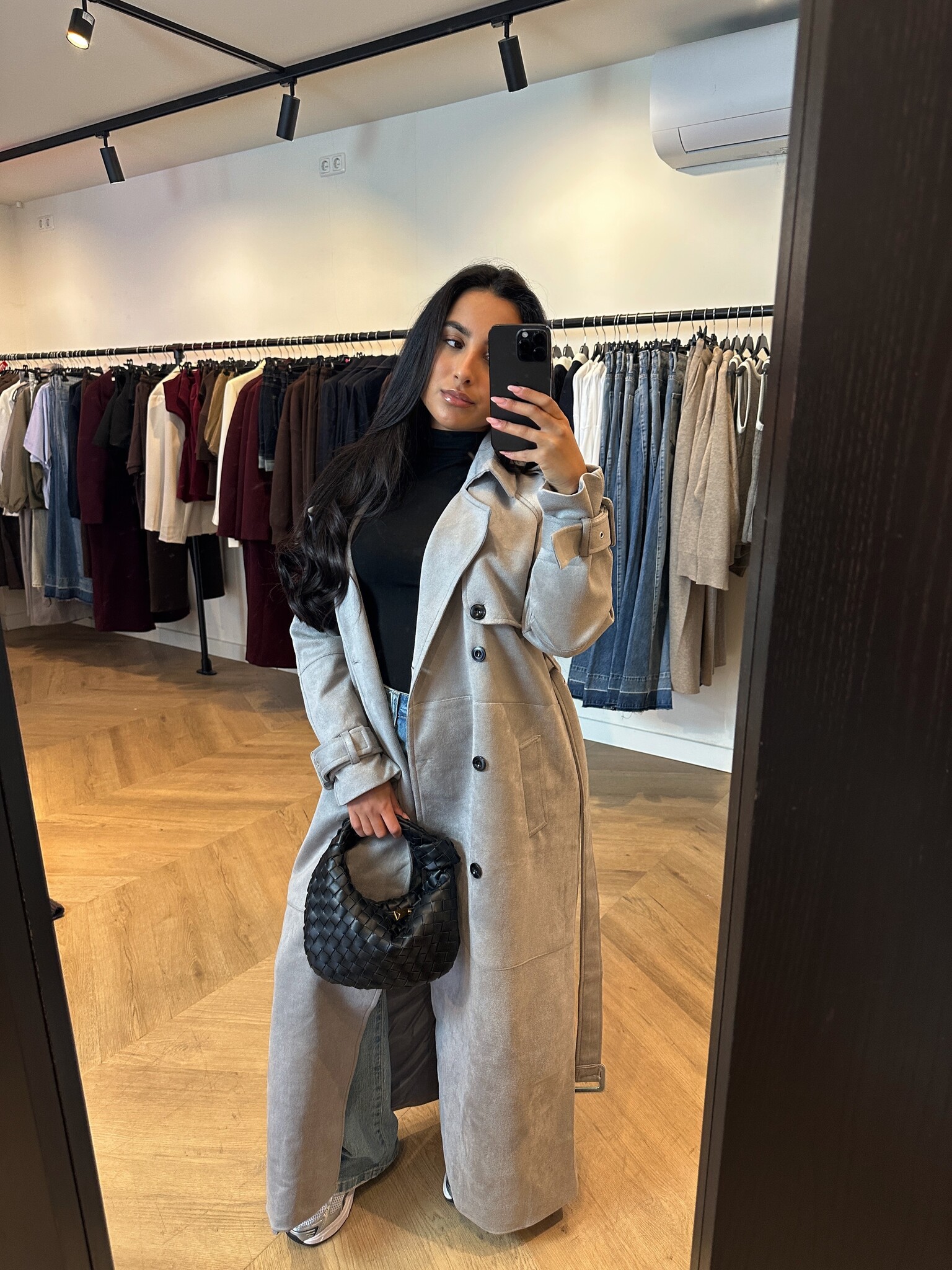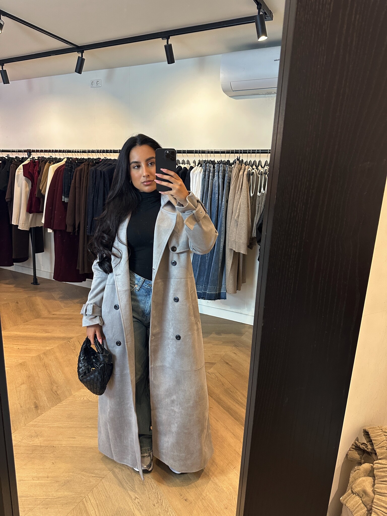 Product omschrijving: Je kunt de jas volledig verstellen met de banden, zowel om de polsen als in de taille. Het is een perfecte herfstjas, in een opkomende trend kleur lichtgrijs.