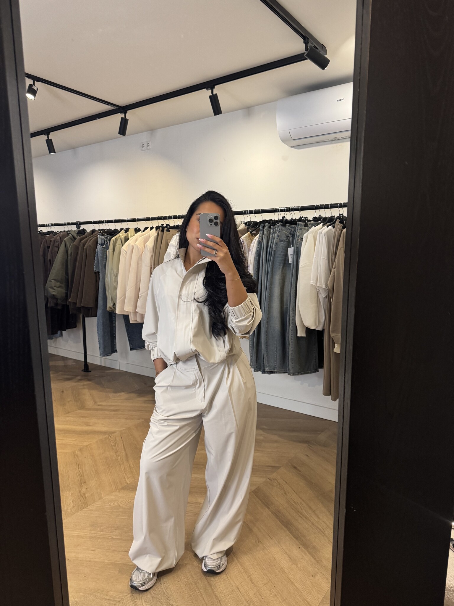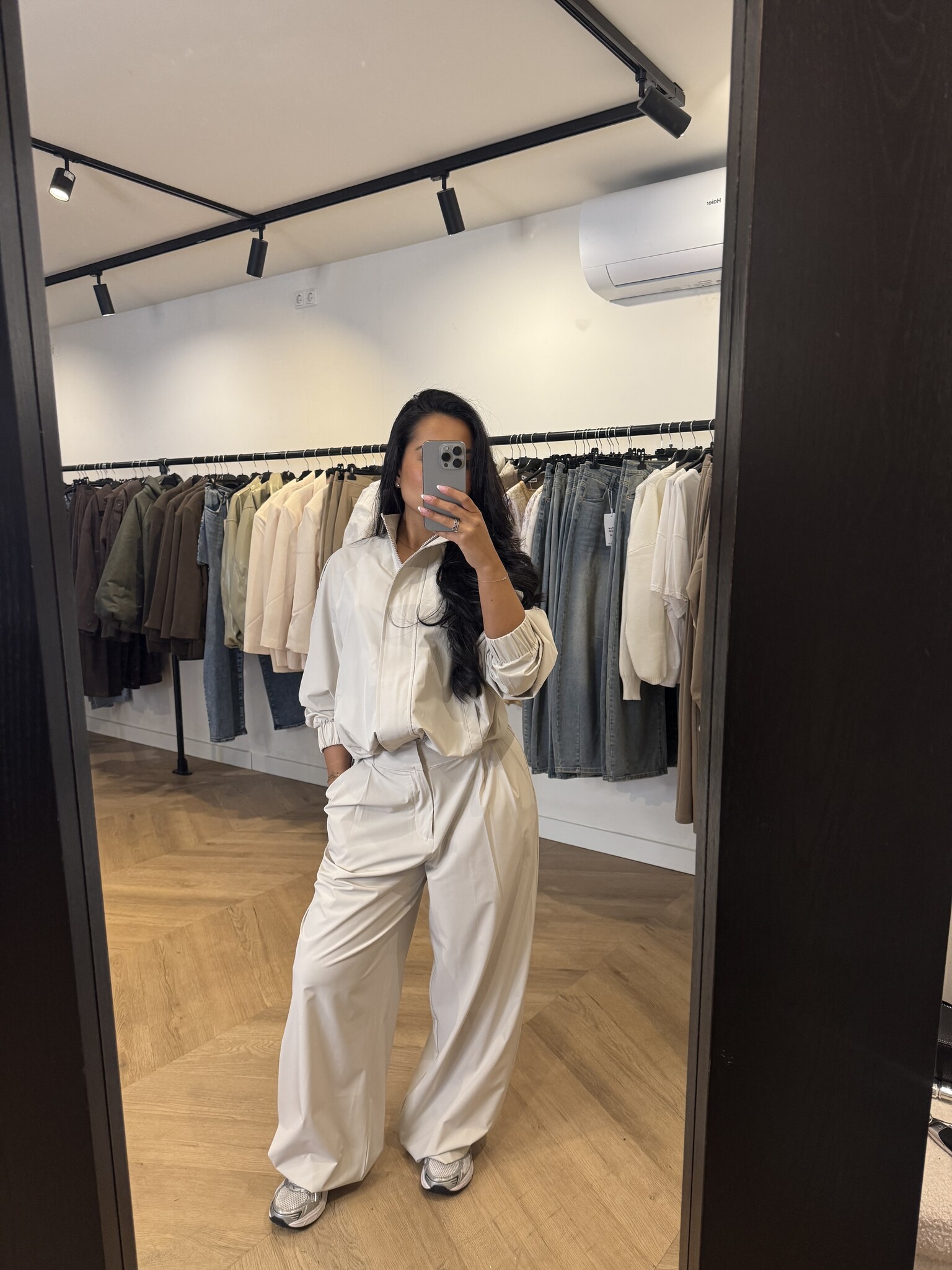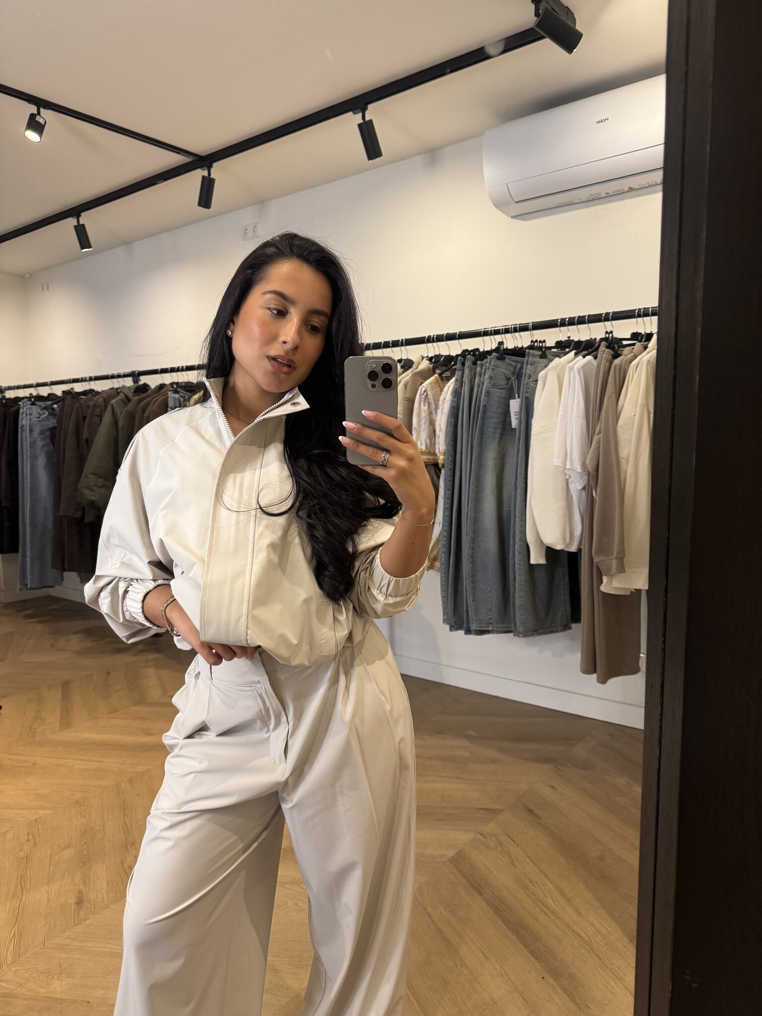 De pantalon heeft een elegante, lange fit en is geschikt tot een lengte van ongeveer 1.75 m. Het vestje heeft een moderne pasvorm en wordt door Noëmy gedragen in maat S/M. Wil je een meer oversized look? Kies dan voor een maatje groter.
