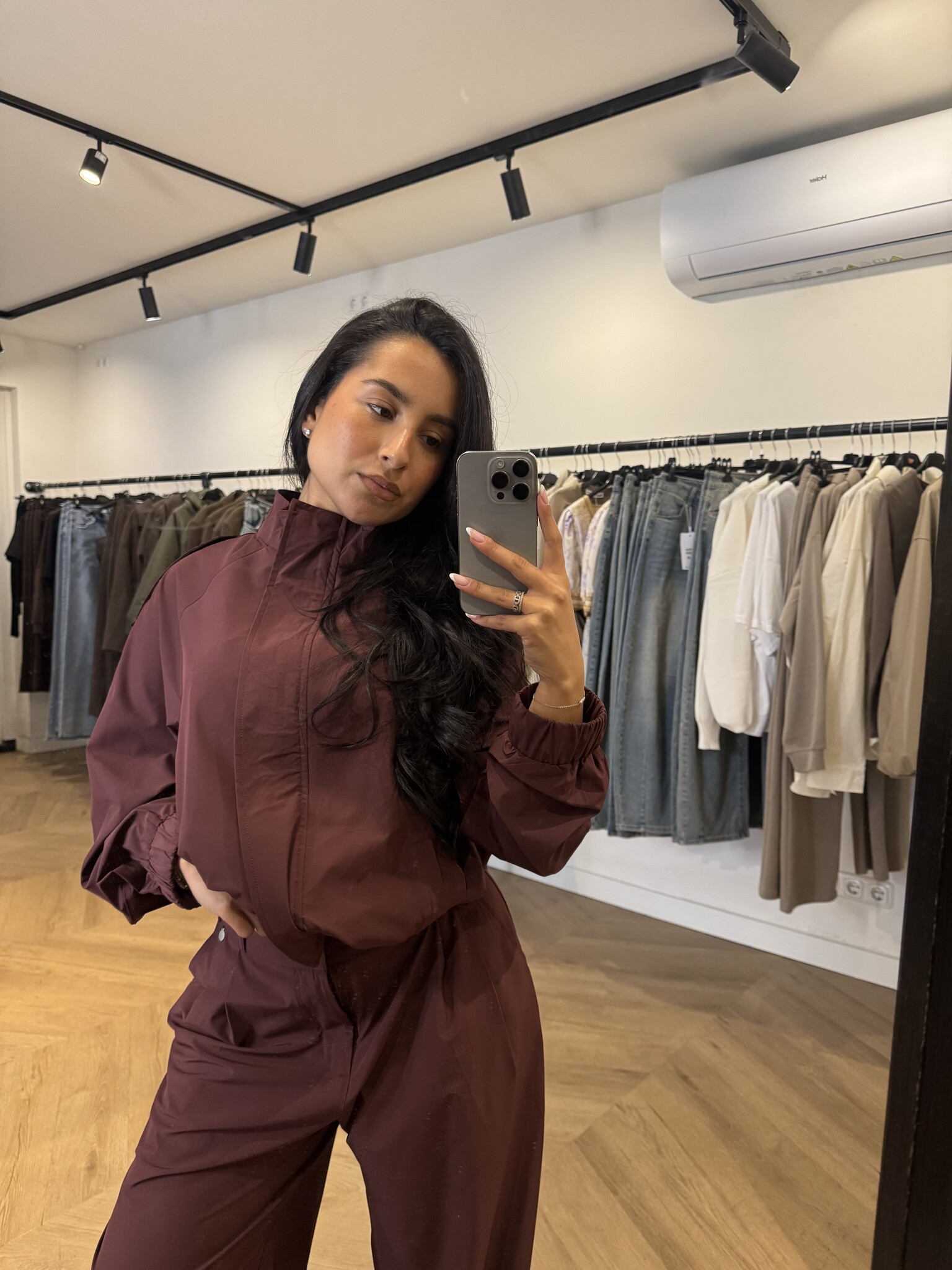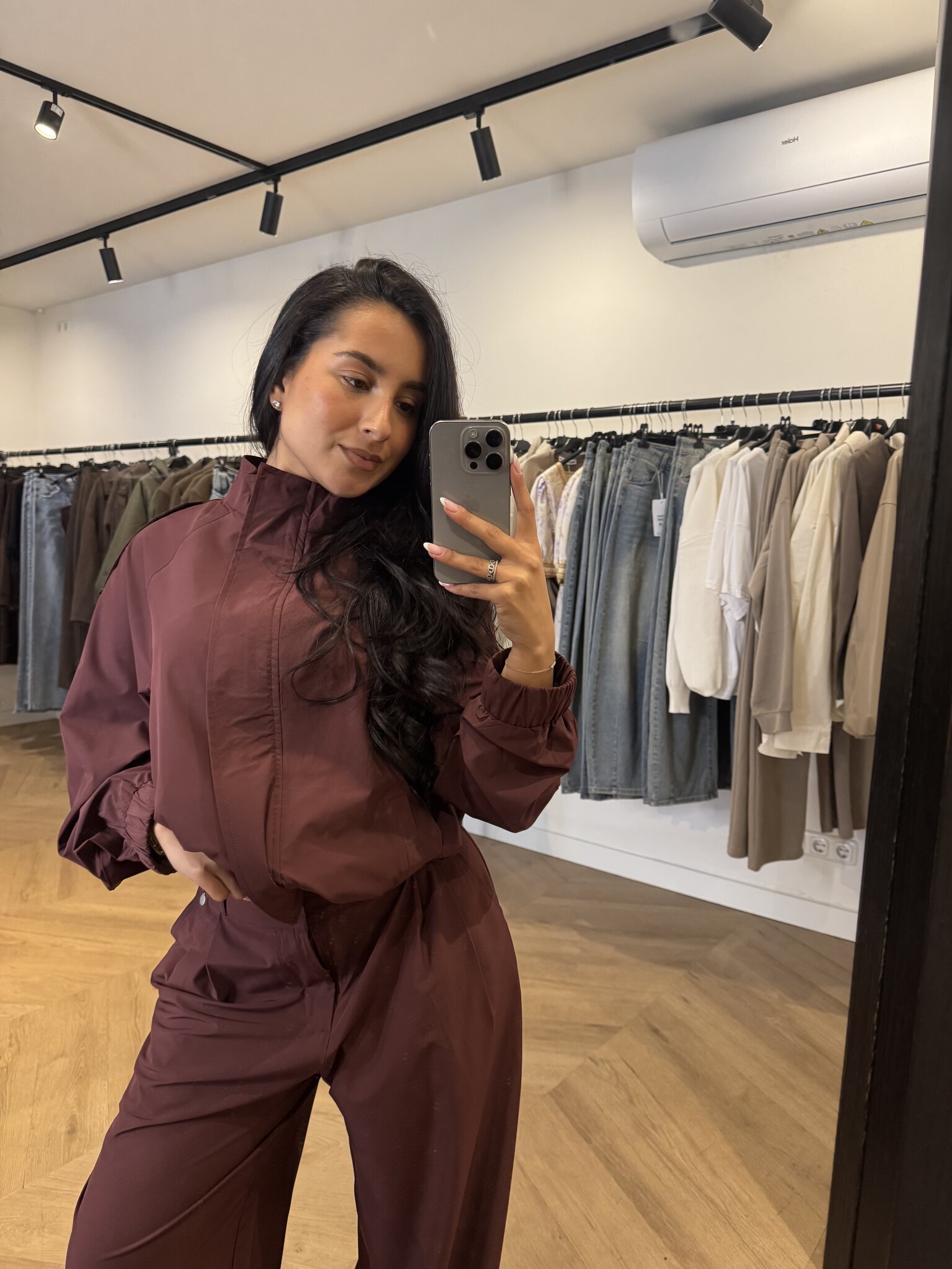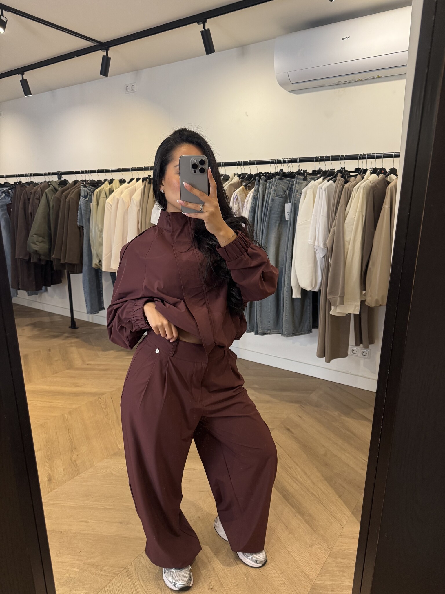 De pantalon heeft een elegante, lange fit en is geschikt tot een lengte van ongeveer 1.75 m. Het vestje heeft een moderne pasvorm en wordt door Noëmy gedragen in maat S/M. Wil je een meer oversized look? Kies dan voor een maatje groter.