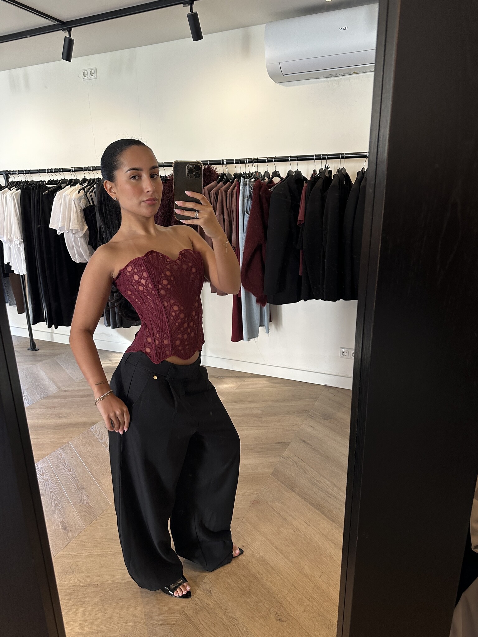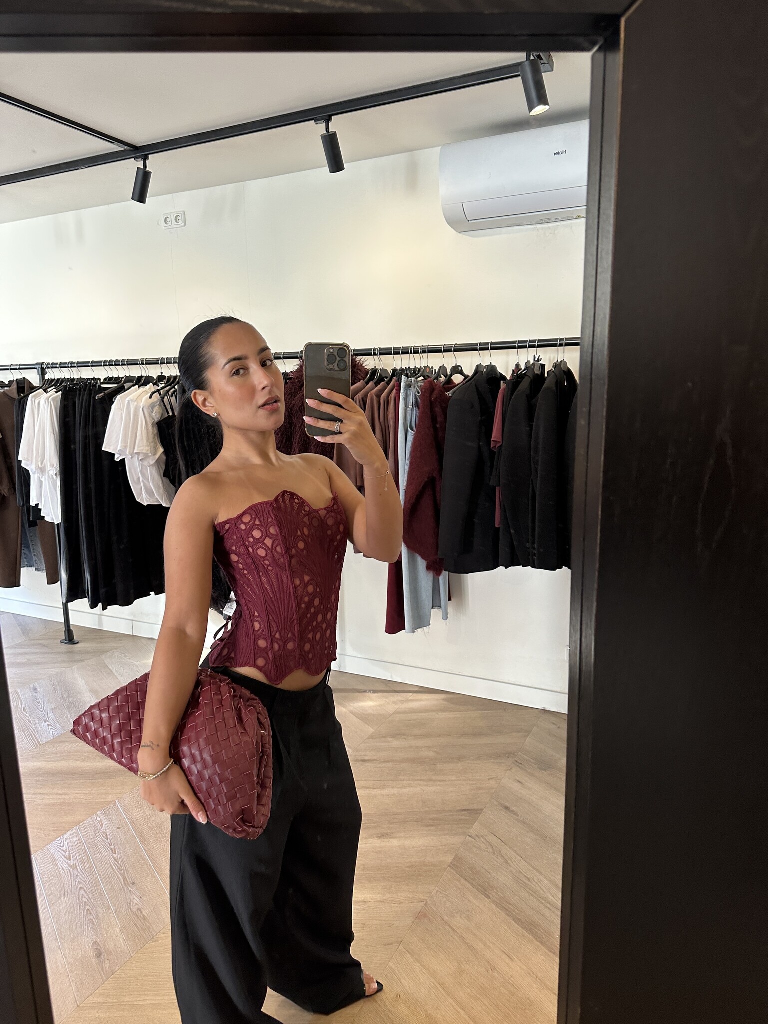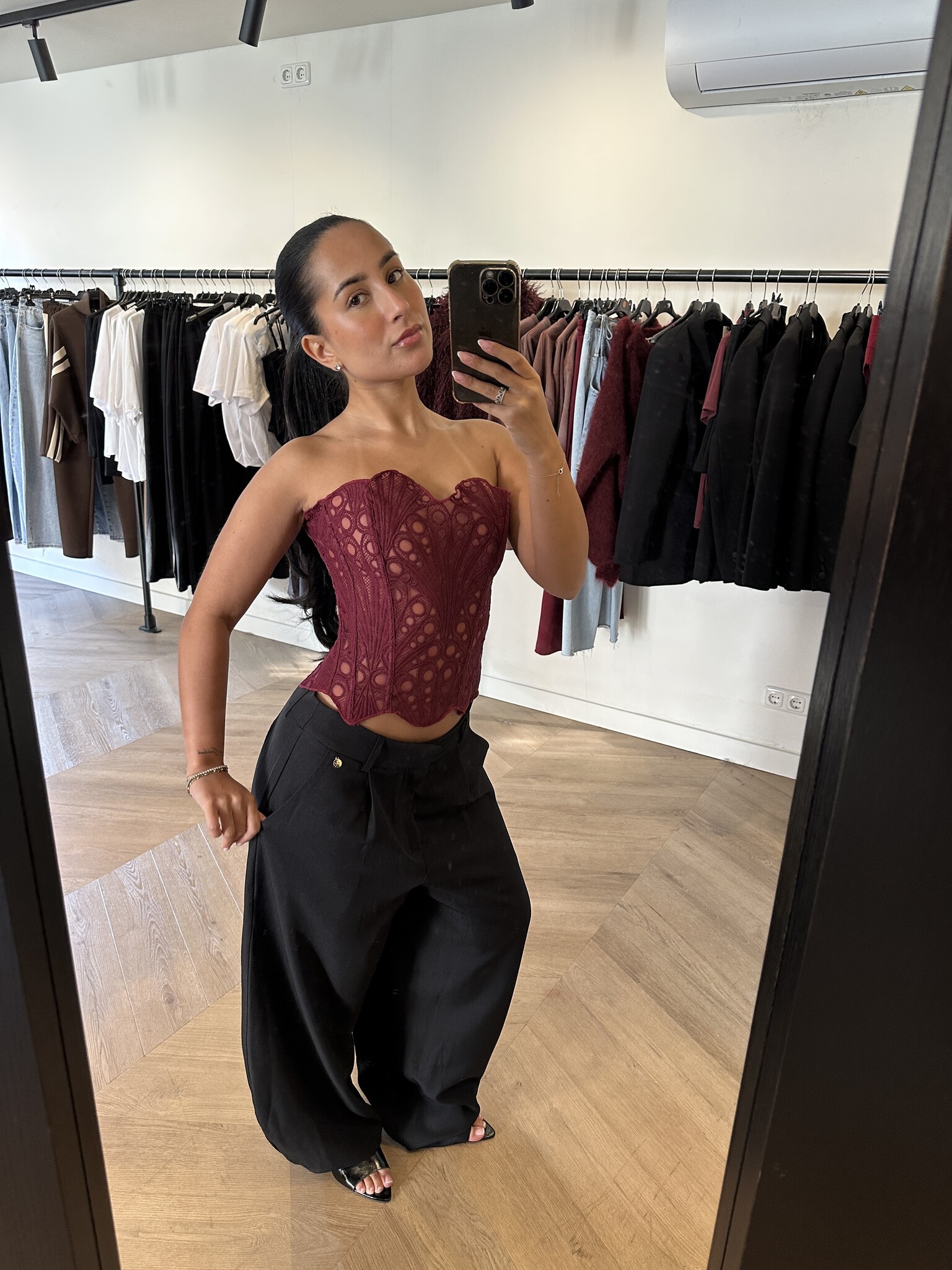 Omschrijving: Dit bordeaux lace corset heeft een elegante uitstraling en een mooie, aansluitende fit. Het kant geeft een vrouwelijke touch en maakt het item perfect om te dragen als statement piece of subtiel te combineren onder een blazer. Het corset is achter te verstellen doormiddel van een vetersluiting waardoor je hem strakker en losser kunt dragen.
